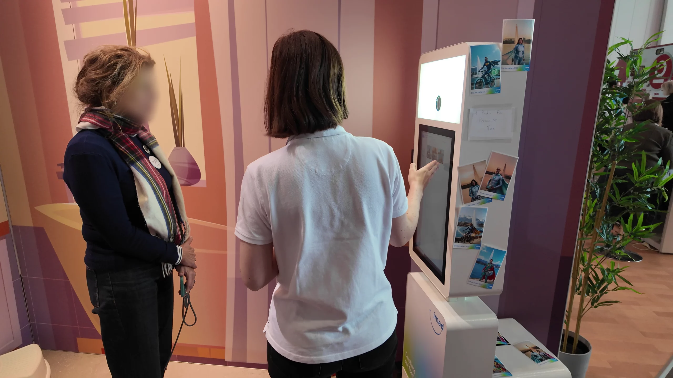 Une borne tout-en-un avec caméra haute résolution, écran tactile, imprimante et logiciel de transformation IA